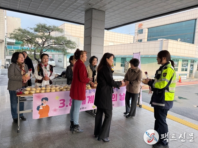 상주시여성단체협의회(회장 김복자)와 상주경찰서(서장 최성열)는 3월 6일(금) 상주경찰서 1층에서 세계 여성의 날(3월 8일)을 기념하여 빵(참정권)과 장미꽃(노동조건 개선)을 전달하는 캠페인을 진행하였다.