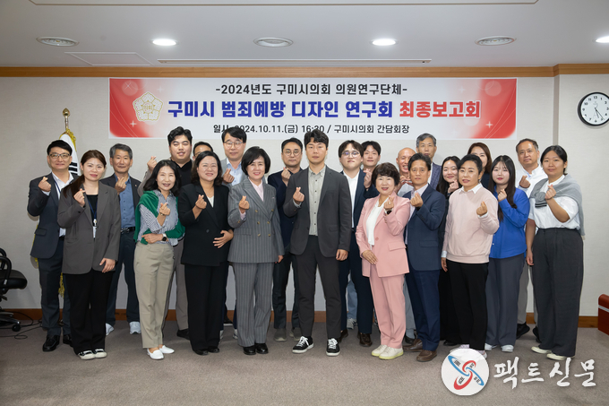 구미시의회(의장 박교상) 의원연구단체 구미시 범죄예방 디자인 연구회(대표의원 허민근)는 10월 11일(금) 16시 30분에 구미시의회 간담회장에서 연구·용역 최종보고회를 개최했다. 이번 보고회에는 연구단체 대표의원과 참여의원(김근한, 김영길, 김정도, 이명희 의원) 및 연구·용역 참여 연구원, 관계 공무원 등 40여 명이 참석했다.