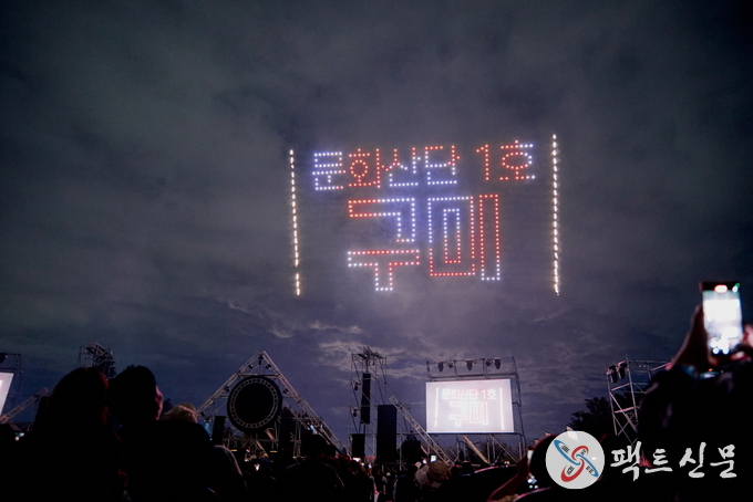 축하공연 후 이어진 드론쇼 <산단의 밤을 밝히다, 구미 드론쇼>에서는 500대의 드론이 구미의 산업 역사와 미래 비전을 밤하늘에 그려내며 환상적인 밤하늘을 연출했다.