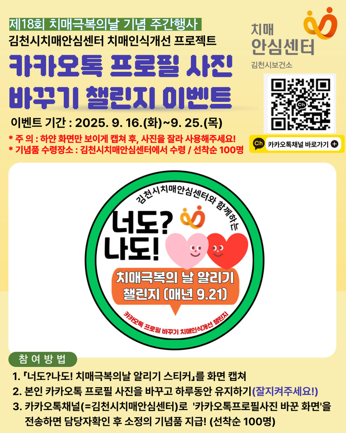 특히 ‘카카오톡 프로필 사진 바꾸기’ 챌린지 캠페인 활동에는 많은 시민이 자발적으로 참여해, 김천 전역으로 치매 인식 개선의 물결이 이어졌다.