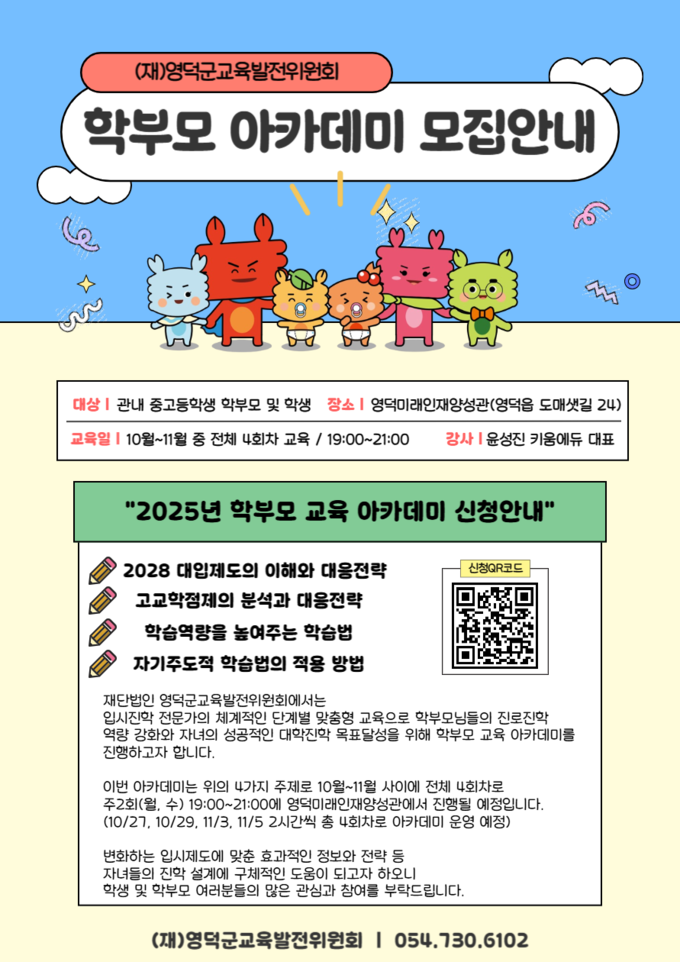 (재)영덕군교육발전위원회는 급변하는 대학입시 환경에 효과적으로 대응하고, 학부모들의 교육 역량 강화를 위해 ‘학부모 교육 아카데미’를 운영한다.