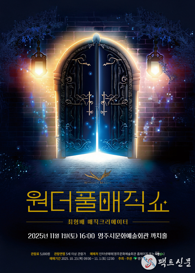 영주시문화예술회관 관계자는 “이번 ‘원더풀매직쇼’는 2025년의 마지막 기획공연으로 시민들과 함께하는 새로운 무대가 될 것”이라며 “가족과 함께 환상적이고 따뜻한 시간을 보내시길 바란다”고 전했다.