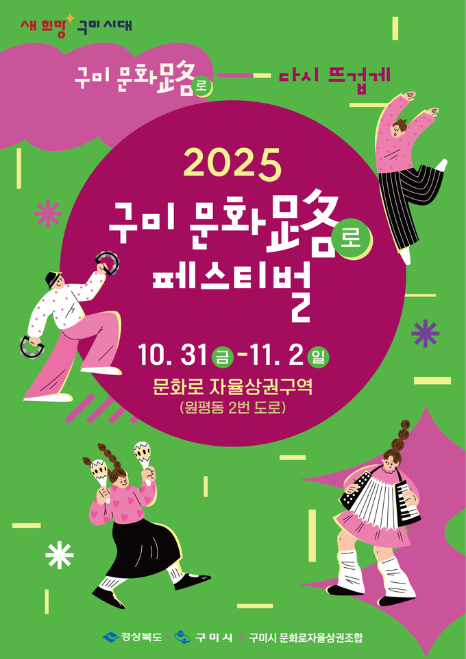 구미시는 10월 31일부터 11월 2일까지 3일간 구미역 앞 문화로 자율상권구역(원평동 2번도로) 일대에서 ‘2025 구미 문화로 페스티벌’을 개최한다. 개막식은 10월 31일 오후 6시 NH농협 구미지점 주차장에서 열린다. 같은 날부터 11월 30일까지는 구미중앙로 93에서 ‘구미마을 젤리상점’ 팝업스토어도 문을 연다.