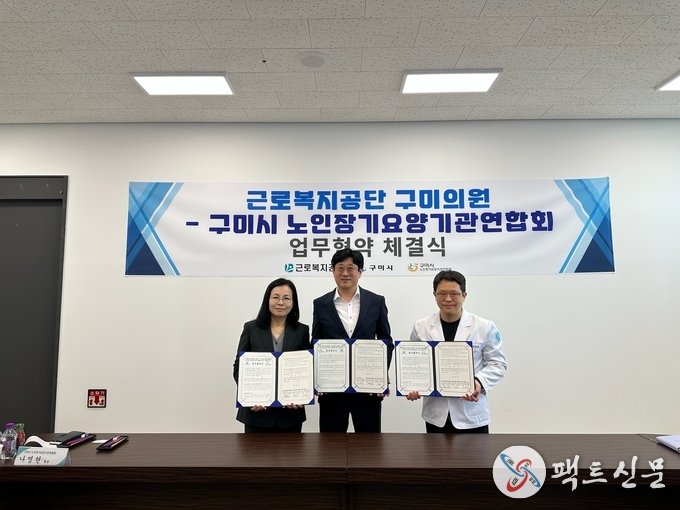 근로복지공단 대구병원(병원장 안면환)·구미의원(센터장 박승범)과 구미시노인장기요양기관연합회(회장 나명현)가 지난 30일 근로복지공단 구미의원 회의실에서 ‘요양시설 근로자 건강증진 및 전문 재활치료 지원’을 위한 업무협약을 체결했다.