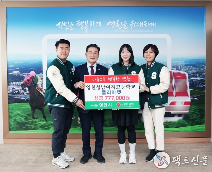영천시는 17일 성남여자고등학교에서 교내 플리마켓 운영 수익금 777,000원을 영천시에 기탁했다고 밝혔다. 이날 전달식에는 유성림 교감, 김홍범 교사, 김채원 학생회장이 참석했다.