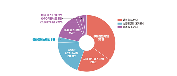 * 라면축제 35만, 푸드페스티벌 20만, 야시장 20.3만, 벚꽃축제 15만, 힙합페스티벌 2만, KPOP콘서트 2만, 산단페스티벌 2.1만, 문화로페스티벌 3만
