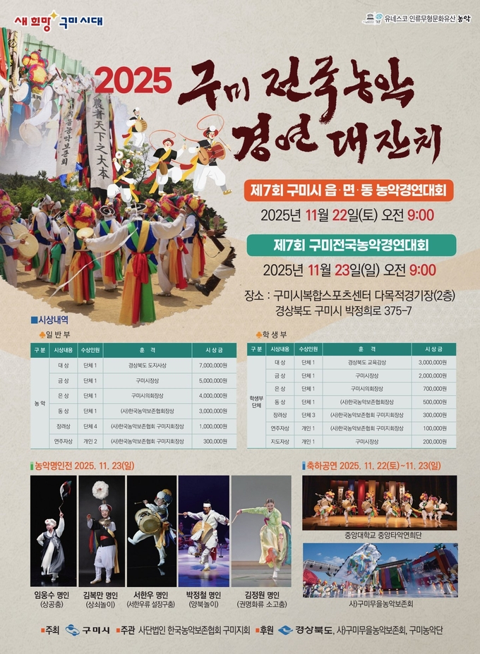 구미시는 11월 22일부터 23일까지 구미시복합스포츠센터 다목적강당에서 「2025 제7회 구미전국농악경연대잔치」를 연다. 이번 대회는 (사)한국농악보존협회 구미지회(지회장 박정철)가 주관하며, 전국 각지의 농악단과 명인들이 참여하는 대표적인 전통예술 경연으로 자리 잡았다.