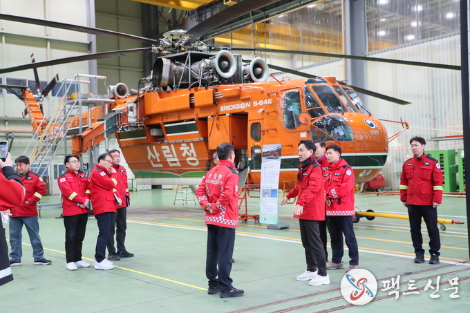 김진태 도지사는 산림항공기 운영현황, 정비체계, 격납고 등 주요 시설을 살펴보며 대응 체계를 면밀히 점검했고, 내년도 산불대응 정책과 추진 계획에 대한 계획을 청취했다.