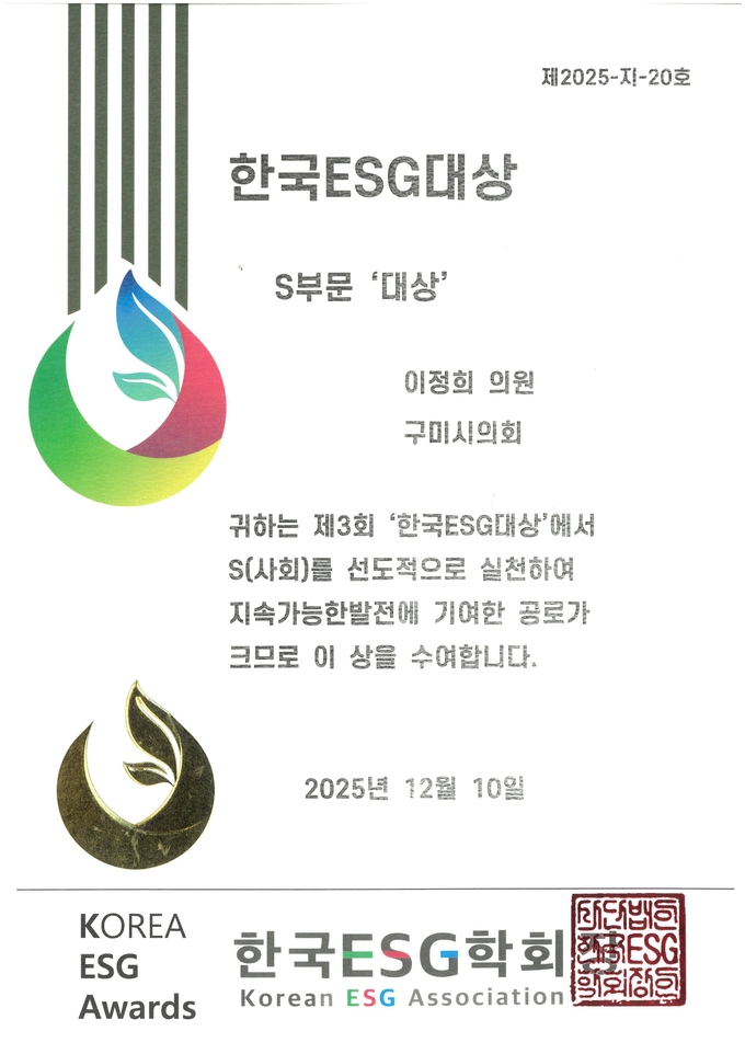 경북 구미시의회 이정희 의원(국민의힘, 비례의원)은 10일 국회도서관에서 열린 ‘제3회 한국ESG대상’ 수상식에서 사회(S) 부문 ESG 대상을 수상했다.
