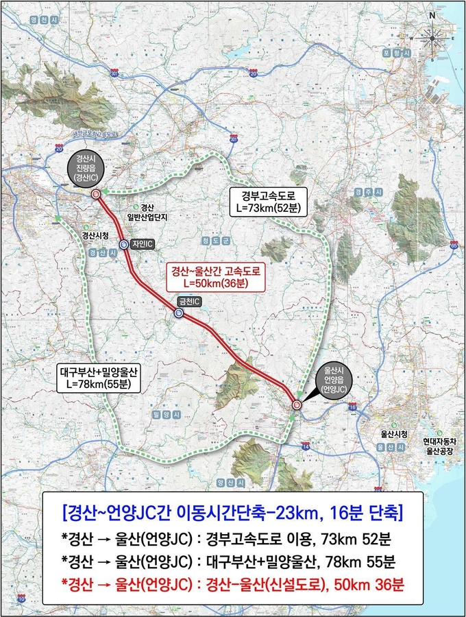‘경산~울산 고속도로’는 경산시 진량읍에서 울주군 언양읍을 잇는 총연장 50㎞ 규모의 고속도로를 신설하는 사업으로, 지금까지 자동차 부품 산업이 집적된 경산시에서 울산광역시까지의 물류 이동은 대부분 신대구부산고속도로를 이용했다.