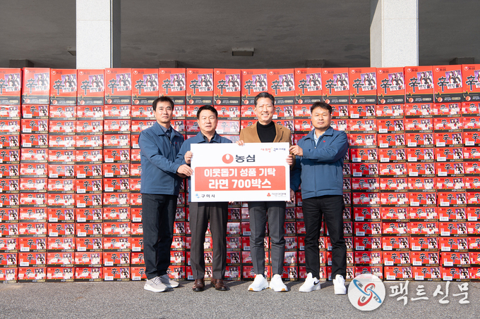 농심㈜ 구미공장은 지난 17일 구미시청 본관 앞에서 지역 내 저소득 가정을 돕기 위해 자사 라면 700박스(약 1천100만 원 상당)를 기탁했다. 이번 기탁은 연말을 맞아 지역사회와의 상생을 실천하고 기업의 사회적 책임을 다하기 위한 나눔 활동의 일환으로 마련됐다. 전달된 물품은 관내 저소득 가정과 취약계층에 지원될 예정이다.