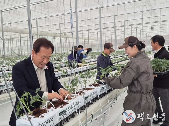 이날 토마토 정식행사에는 박현국 군수와 농업기술센터 관계자를 비롯한 입주 청년농업인과 가족들이 참여한 가운데 임대형 스마트팜 B동에 서양계 토마토 ‘데프니스(Dafnis)' 2만 6,000주를 처음으로 정식했다.