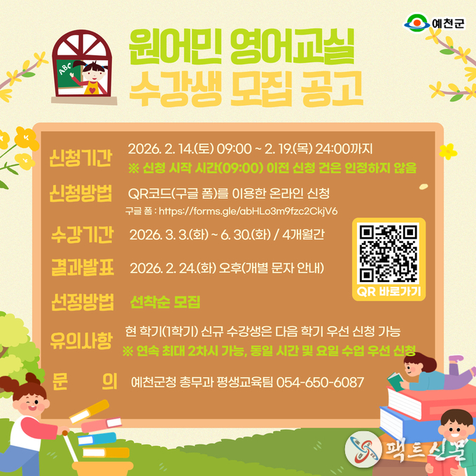 예천군(군수 김학동)은 교육발전특구 사업의 일환으로 관내 미취학 및 초등학생의 영어 의사소통 능력 향상을 위해 2026학년도 정규 1학기 원어민 영어교실 수강생을 모집한다고 밝혔다.