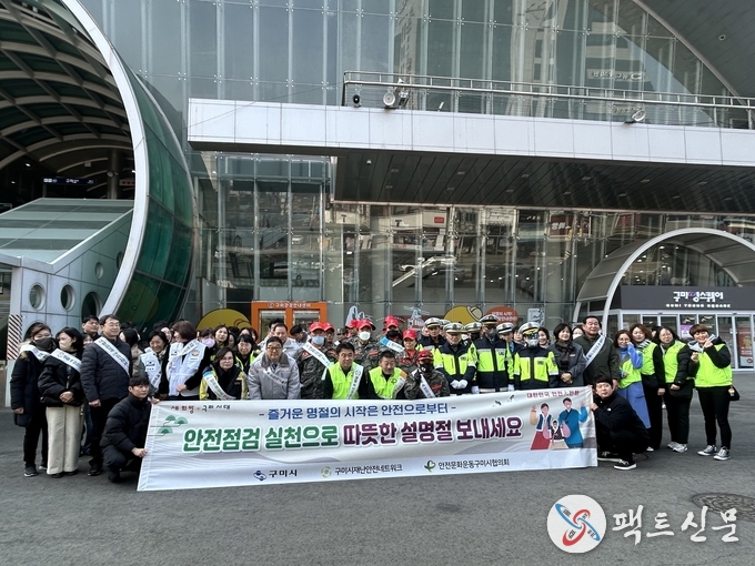구미시는 민족 최대 명절인 설을 앞두고 지난 13일 구미역 일원에서 제338차 안전점검의 날을 맞아 「안전한 설 명절 보내기 캠페인」을 개최했다. 이날 행사에는 구미시 재난안전네트워크 회원 150여 명이 참여해 귀성객과 시민을 대상으로 생활 밀착형 안전수칙을 집중 홍보했다.