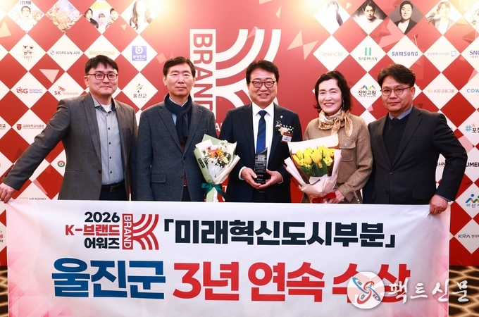 울진군은 2월 25일 서울 더 플라자호텔에서 열린‘2026 K-브랜드 어워즈’시상식에서 3년 연속 미래혁신도시 부문 대상을 수상했다.