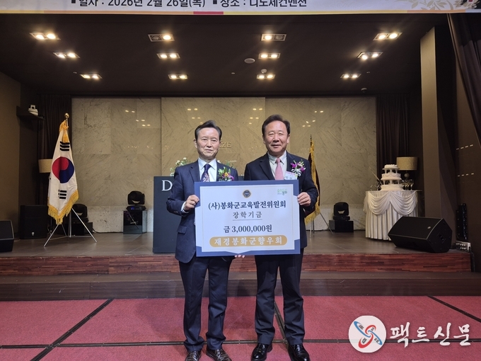 (사)봉화군교육발전위원회(이사장 박현국)는 2월 26일(목) 서울 디노체컨벤션에서 개최된 재경봉화군향우회 정기총회 및 회장 이·취임식 자리에서 지역 인재 육성을 위한 장학금 300만원을 전달받았다고 밝혔다.