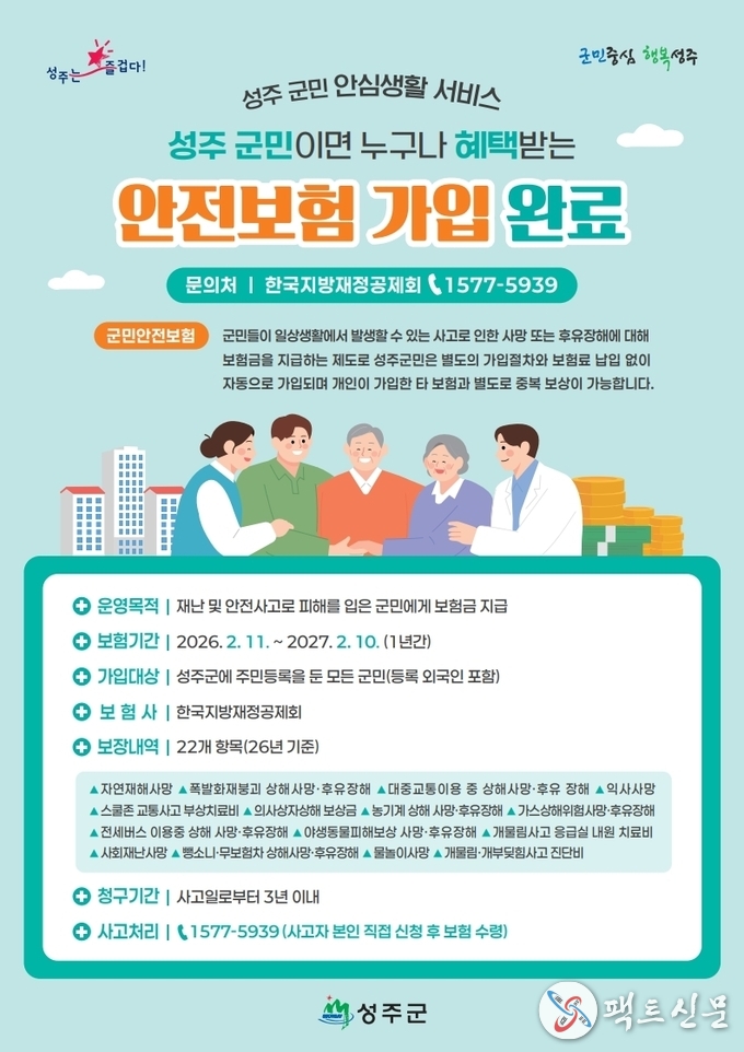 성주군은 재난이나 일상생활에서 발생할 수 있는 각종 사고 피해를 보상하는 ‘성주군 군민안전보험’가입으로 군민들의 생활 안정과 촘촘한 사회안전망을 구축에 앞장섰다.