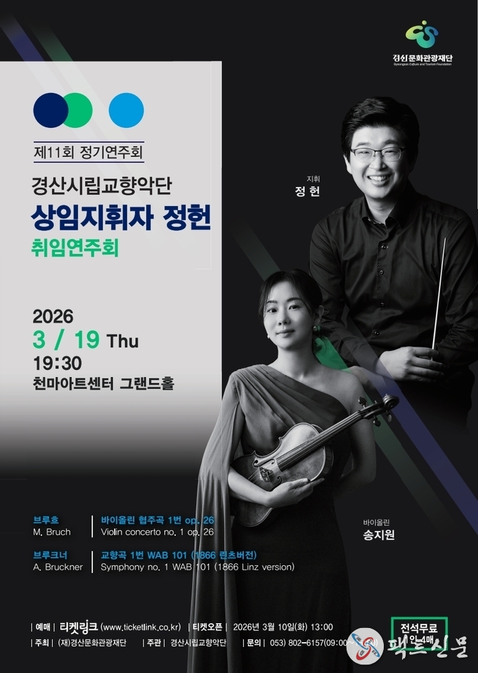 이번 공연은 경산시립교향악단 정헌 상임지휘자의 취임 연주회로, 막스 브루흐(Max Bruch)의 ‘바이올린 협주곡 제1번’과 안톤 브루크너(Anton Bruckner)의 ‘교향곡 제1번(1866 Linz version)’을 선보인다.