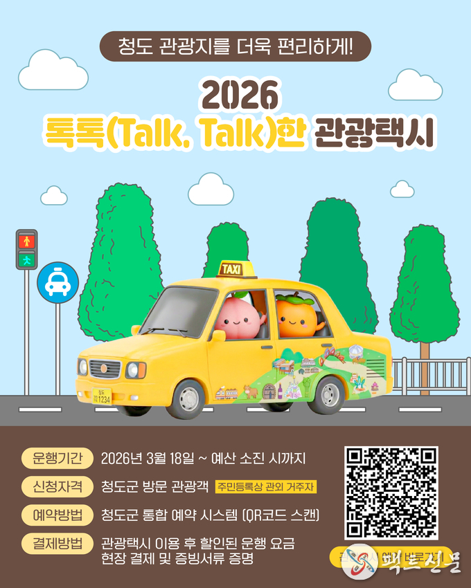 청도군(군수 김하수)은 개별 여행객 증가 등 관광 트렌드 변화에 대응하고 관광객의 이동 편의를 높이기 위해 오는 3월 18일부터 “2026년 청도군 톡톡(Talk, Talk)한 관광택시” 사업을 본격 운영한다.