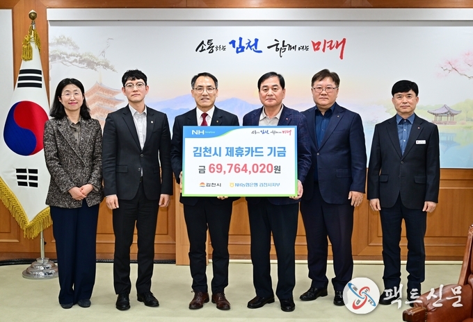 이날 전달된 기금은 6,976만 원으로, 이는 김천시와 NH농협은행 간 제휴 협약에 따라 지난해 법인카드 및 보조금 카드 사용액의 일정 비율(0.2~1%)이 적립된 금액이다.