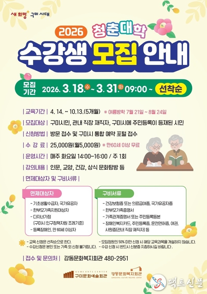 구미시강동문화복지회관은 3월 18일부터 3월 31일까지 ‘청춘대학’ 수강생을 모집한다.