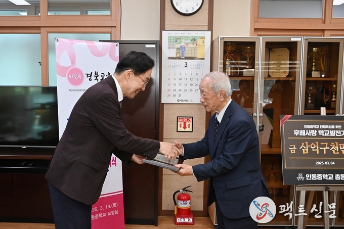 이에 인동중학교 황인일 교장은 “교육감님께서 직접 학교를 방문하여 우리 인동중학교 총동창회의 노고를 격려해 주심에 깊은 감사를 드리며, 선배님의 소중한 뜻을 받들어, 학생들이 바른 인성과 실력을 겸비한 미래 인재로 거듭나도록 전 교직원이 힘쓰겠다”고 말했다.
