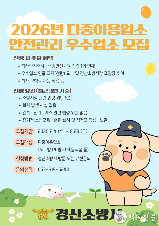 경산소방서는 다중이용업소 관계인의 자율안전관리 문화 정착과 안전한 영업 환경 조성을 위해 ‘2026년 다중이용업소 안전관리 우수업소’를 선정한다고 밝혔다.