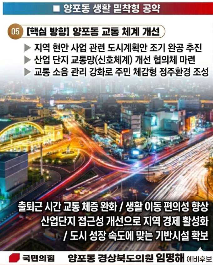 임명해 구미시 양포동 경북도의원 예비후보가 교통 불편 해소와 도시 기반 확충을 위한 ‘교통 및 도시 기반 개선’ 공약을 내놓으며 주민 생활환경 개선 의지를 밝혔다.