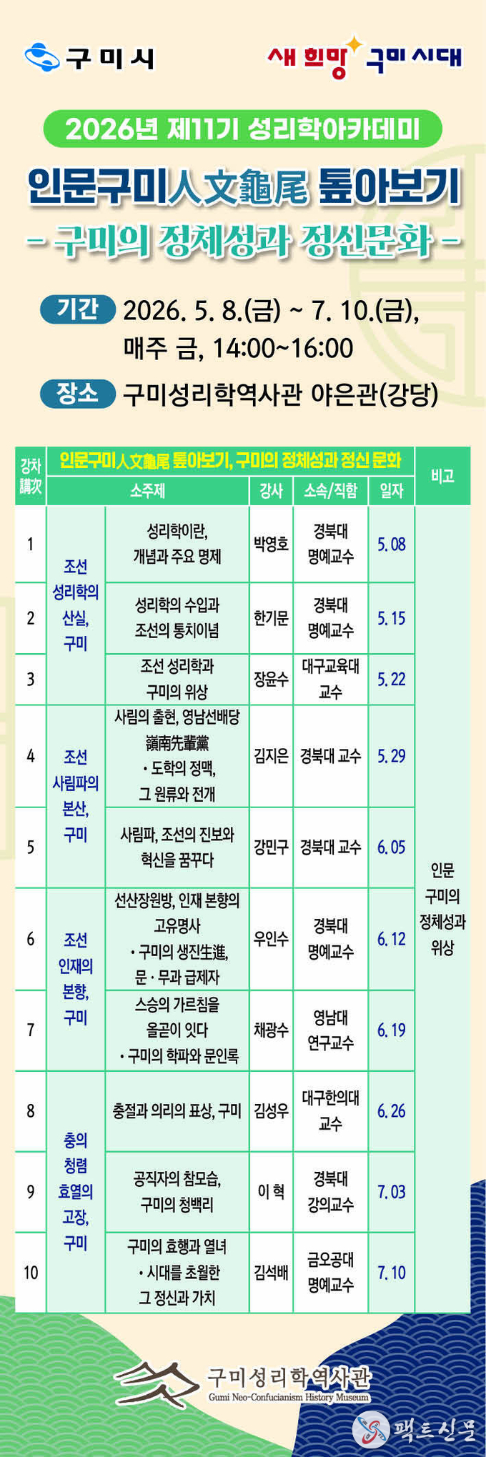 강좌는 5월 8일부터 7월 10일까지 매주 금요일 오후 2시부터 4시까지 운영된다. 박사급 이상 전문 강사를 초빙해 조선성리학의 산실’, ‘조선사림파의 본산’, ‘조선인재의 본향’, ‘충의·청렴·효열의 표상’ 등 구미가 지닌 인문적 가치를 다각도로 조명한다. 이를 통해 15세기 이후 이어온 인문도시로서의 위상을 재확인하고, 시민들의 자긍심을 높이는 데 초점을 맞췄다.