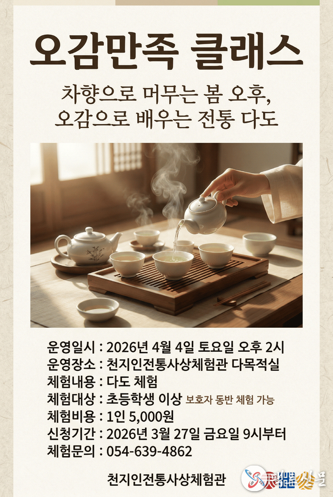 먼저 오는 4월 4일 오후 2시에는 ‘오감만족 클래스(차향으로 머무는 봄 오후, 오감으로 배우는 전통 다도)’가 진행된다. 체험관 다목적실에서 운영되는 이번 프로그램은 다도체험을 통해 전통 차 문화를 배우고 직접 체험할 수 있도록 구성됐다. 모집 대상은 초등학생 이상 15명이며, 초등학생 미만은 보호자 동반 시 참여할 수 있다.