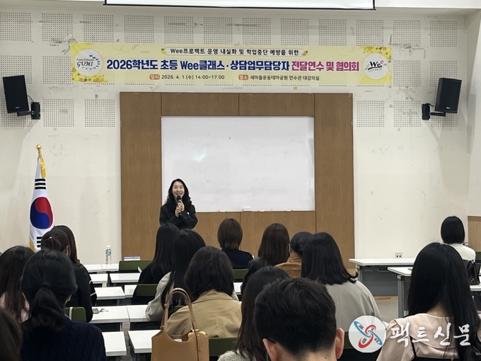 경상북도구미교육지원청(교육장 민병도)은 4월 1일(수), 4월 3일(금) 14시부터 새마을운동테마공원 연수관 대강의실에서 관내 초·중·고·특수학교 전문상담교사 및 전문상담사, 상담업무담당자 105명을 대상으로 ‘2026학년도 위(Wee)프로젝트 운영 활성화 및 학업중단예방을 위한 전달 연수 및 협의회’를 실시하였다.