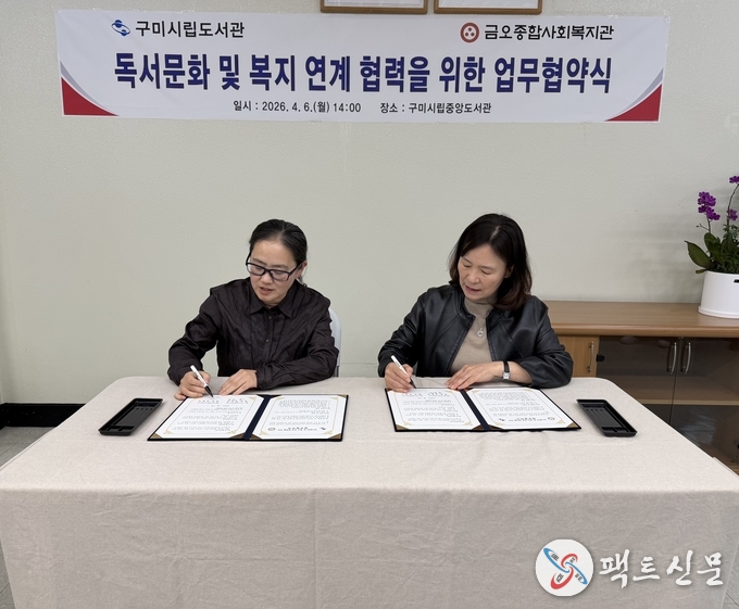 구미시립중앙도서관은 6일 시립중앙도서관에서 금오종합사회복지관과 지역사회 독서문화 확산과 복지 증진을 위한 업무협약(MOU)을 체결했다.
