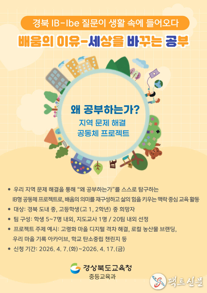 경북교육청(교육감 임종식)은 학생들이 스스로 질문하고 삶과 연결된 배움을 실천하는 교육을 위해 ‘배움의 이유–세바공(세상을 바꾸는 공부)’ 프로그램을 운영하고, 오는 17일까지 참여 학생을 모집한다고 밝혔다.