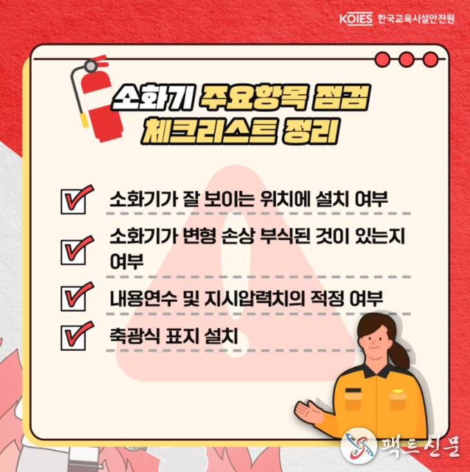 최근 소화기 내용연수가 경과된 제품에 대해 교체가 아닌 검사필증 등을 부착하고 비용을 받아가는 과잉·허위 점검 사례가 발생하고 있어 각별한 주의가 요구된다.