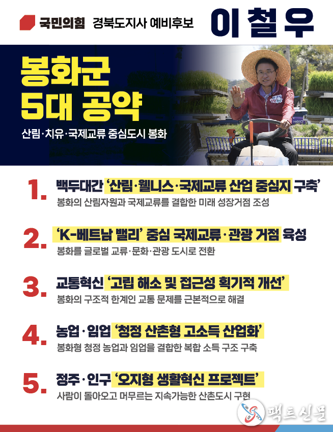 이 후보는 봉화·청송·영양을 아우르는 산림·농업 산업 구조 혁신을 통해 북부권 경제 체질을 근본적으로 바꾸겠다고 강조했다.