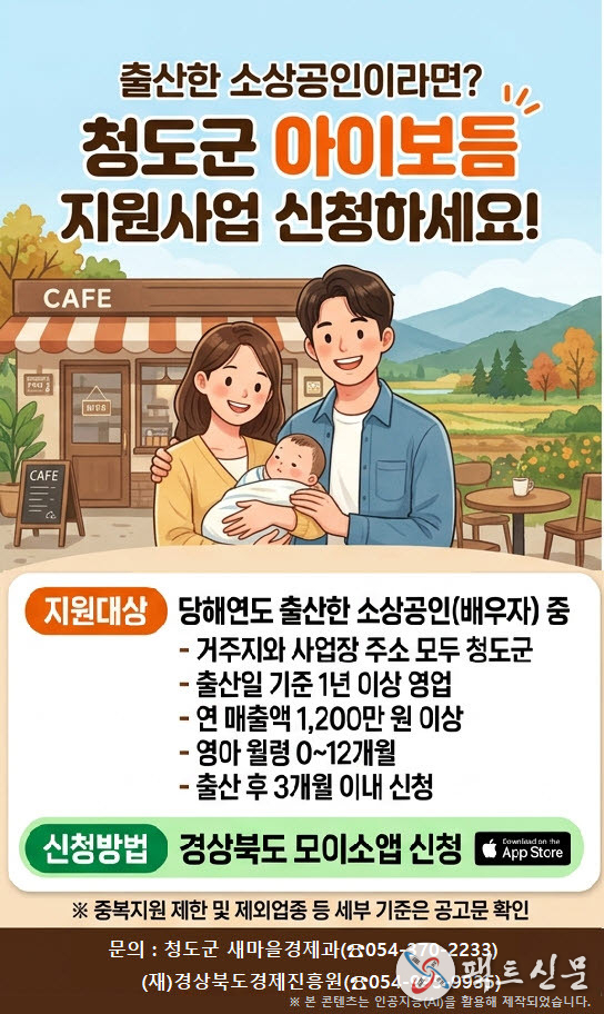 청도군(군수 김하수)은 출산으로 인한 소상공인의 경영 공백을 줄이고 안정적인 영업활동을 지원하기 위해 “2026년 소상공인 아이보듬 지원사업”을 추진한다고 밝혔다.