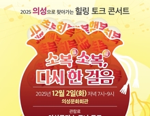 [팩트신문 = 이상혁 기자] 의성군(군수 김주수)은 경상북도와 경북문화재단이 올해 상반기 산불로 피해를 입은 지역민들을 위로하기 위해 추진 중인 치유형 문화예술행사 「찾아가는 힐링 토크콘서트 – 소복소복, 다시 한 걸음」의 마지막 공연을 오는 12월 2일(화) 오후 7시, 의성문화회관에서 개최한다고 밝혔다. 이번 공연은 안동, 영양, 청송을 거쳐 마지막으로 의성에서 열리는 순회공연으로, 산불 피해 주민들과 지역민이 함께 예술을 통해 마음을 치유하고 서로를 격려하는 뜻깊은 자리가 될 예정이다. 의성군 프로그램은 ▲팽현숙·한기웅의 힐링 토크 ▲도내예술단체 공연(보람할매연극단과 울림) 무대 ▲나상도(미스터트롯2 TOP4)·곽지은(미스트롯3 TOP9)의 초청 공연 등으로 구성되어 다채로운 볼거리와 감동을 선사한다. 공연은 무료로 진행되며, 약 400여 명의 지역민이 함께 참여해 토크와 공연이 어우러진 따뜻한 무대를 즐길 예정이다. 김주수 의성군수는 “이번 힐링 토크콘서트가 산불 피해로 어려움을 겪은 주민들에게 작은 위로와 희망의 메시지가 되길 바란다”며, “의성군은 앞으로도 문화예술을 통해 군민의 마음을 보듬고 함께 회복하는 지역공동체를 만들어 가겠다”고 말했다.