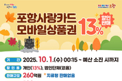 [팩트신문 = 김건융 기자] 포항시는 추석 명절 지역경제 활력 제고를 위해 내달 1일부터 카드형·모바일 포항사랑상품권(이하 포항사랑카드)을 260억 원 규모로 13% 할인 판매한다. 시는 지난 9일 발행한 600억 원 규모 상품권이 완판됨에 따라, 내달에도 13% 할인 판매를 통해 시민과 소상공인들에게 직접적인 혜택을 제공하고, 지역 골목상권 소비 촉진의 마중물 효과를 이어가겠다는 방침이다. 올해 포항시는 당초 목표보다 500억 원 확대한 총 3,000억 원 규모의 상품권을 발행한다. 연말까지 매월 초 상품권을 발행하며 13% 할인율을 유지해 지역 자금 역외 유출을 막고 소상공인 매출 증대, 지역경제 선순환 구조 강화에 기여할 계획이다. 개인별 구매 한도는 월 50만 원, 보유 한도는 100만 원으로 조정된다. 개인을 대상으로만 할인하고, 지류형은 판매하지 않는다. 상품권은 10월 1일 0시 15분부터 모바일 앱 ‘iM샵’에서 충전할 수 있으며, 104개 판매대행 금융기관 영업점에서도 영업시간 내 충전이 가능하다. 포항사랑카드는 실물카드 결제 외에도 ▲삼성페이 ▲네이버페이 QR결제 ▲모바일 앱 iM샵 QR결제 등 다양한 결제 수단을 지원한다. 지역 내 2만