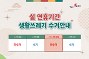 [팩트신문 = 이상혁 기자] 성주군은 설 명절을 맞아 귀성객과 주민들이 쾌적한 환경 속에서 명절을 보낼 수 있도록 2월 2일(월)부터 2월 20일(금)까지 「설 연휴 쓰레기 종합관리대책」을 추진한다. 군은 연휴 기간 귀성객과 군민의 생활 불편을 최소화하기 위해 연휴를 전·중·후로 구분한 대응체계를 마련한다. 연휴 전에는 주요거리 등의 쓰레기 중점 수거와 환경정비를 실시하고 음식물쓰레기 증가에 대비한 비상 수거용기를 비치한다. 연휴 중에는 특별상황반을 운영해 생활폐기물 처리와 민원에 대응하며, 읍·면의 상황반과 비상연락체계를 유지한다. 연휴 이후에는 마무리 대청소와 노면청소차 운영을 통해 깨끗한 환경 조성에 힘쓸 계획이다. 특히 명절 선물 포장 등으로 스티로폼 상자와 종이박스 배출이 증가할 것으로 예상됨에 따라, 관내 유통업소에서 판매되는 설 선물류의 과대포장 및 재포장 행위에 대해서도 점검을 실시한다. 또한 주민들에게 배출장소 내 무분별한 투기를 예방하기 위한 지도·단속과 함께 재활용품 올바른 분리배출 방법에 대한 홍보를 강화할 예정이다. 자원순환사업소 관계자는 “설 명절 기간 생활폐기물 발생량이 급증할 것으로 예상된다”며 “원활한 수거 처리와 청결한 환경